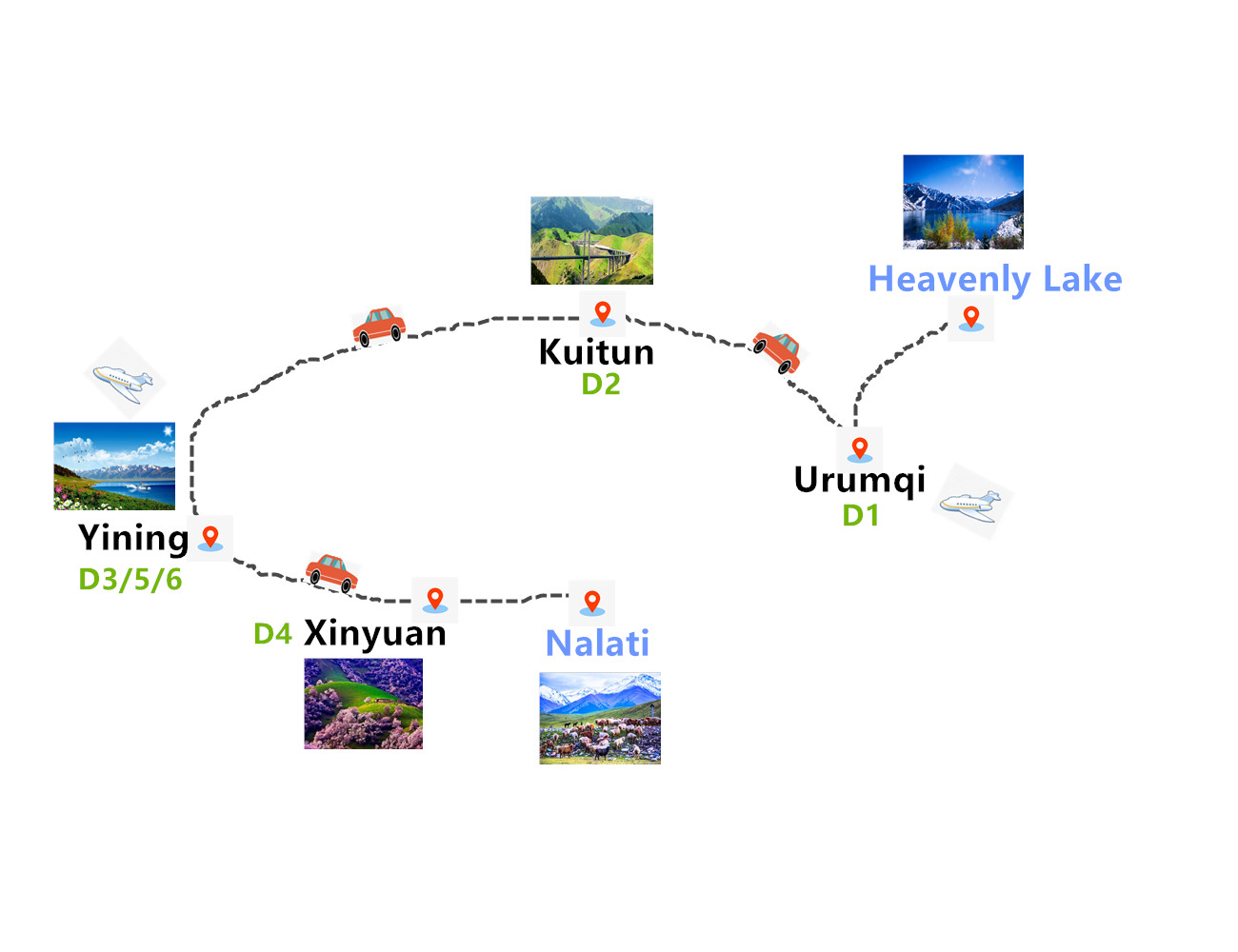This is a unique trip full of diverse things to see and experience. You will explore the northern Xinjiang, the most attracting region which is known for diversity of culture as well as beautiful landscape. You will start the trip from Urumqi to soak into its vitality and busyness; then, be amazed at the picturesque Heavenly Lake, Sayram Lake and the famous Guozigou Bridge. Lastly, go to experience the folk-style elegance and immersed in the vast grassland and flower sea in Nalati and Xinyuan.