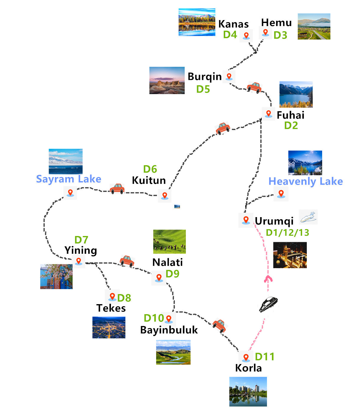 13 Days Wonderful Tour covers all the essential sights in northern Xinjiang. The heavenly wonderland Kanas, tranquil village in Hemu, boundless green Nalati Grassland, crystal-like Sayram Lake and the only large-scale cultural scenic spot in Northern Xinjiang--Kazanqi Folk Village. If you are looking for an exclusive northern Xinjiang tour showing both the beauty of nature and special ethnic culture, this one should be on your list!