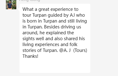 What a great experience to tour Turpan guided by AJ who is born in Turpan and still living in Turpan. Besides driving us around, he explained the sights well and also shared his living experiences and folk stories of Turpan. Thanks!