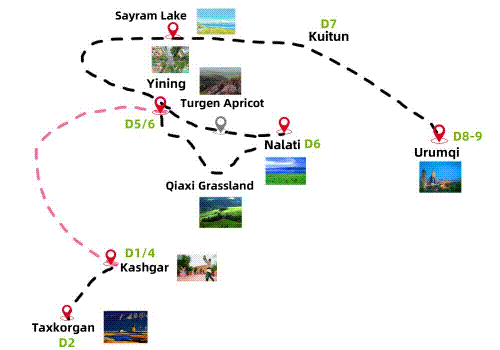 Looking for a leisurely spring escape to Xinjiang? This trip is perfect for you. Stroll through Kashgar's well-preserved Uyghur old town, soak in its unique charm, and explore stunning spots like Nalati Grasslands, Turgan Apricot Valley in full bloom, and the serene Sayram and Heavenly Lakes. Experience Xinjiang's natural beauty and cultural richness at a relaxed pace, creating unforgettable memories along the way.