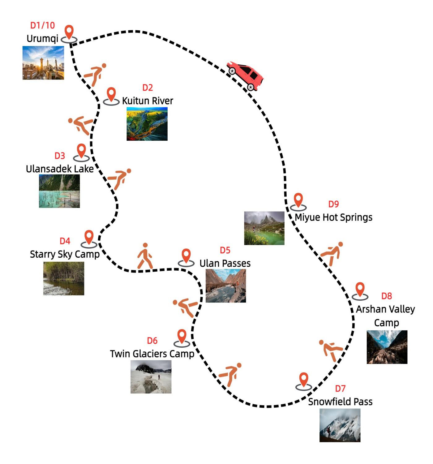 We'll arrive in Urumqi at 8:00 AM, marking the end of our incredible journey. From here, you're free to continue your travels or head home, carrying with you the memories of an unforgettable adventure through the stunning landscapes of the Tianshan Mountains. Bon voyage, and we hope to see you on another adventure soon!